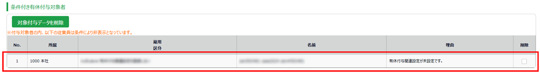 - 有休付与関連設定が未設定の雇用区分に異動した場合など、年次有休付与対象外となった場合に対象従業員と理由が表示されるようになります。