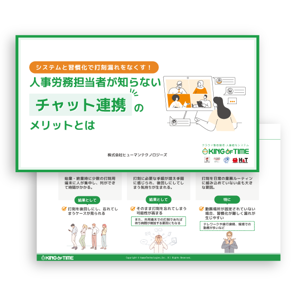 勤怠管理を行う上で担当者の大きな課題となるのが従業員の打刻漏れです。そんな打刻漏れとチャット連携についてまとめたお役立ち資料です。実態調査をもとに、打刻漏れが発生する原因や改善方法、チャット連携による打刻がおすすめできる理由をわかりやすくご紹介しております。ぜひ資料をダウンロードしてご覧ください。